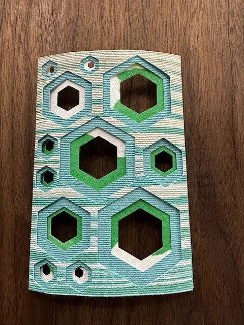 Egyedi DIY kép hexagon színes kék, zöld lapok fehér képkerettel